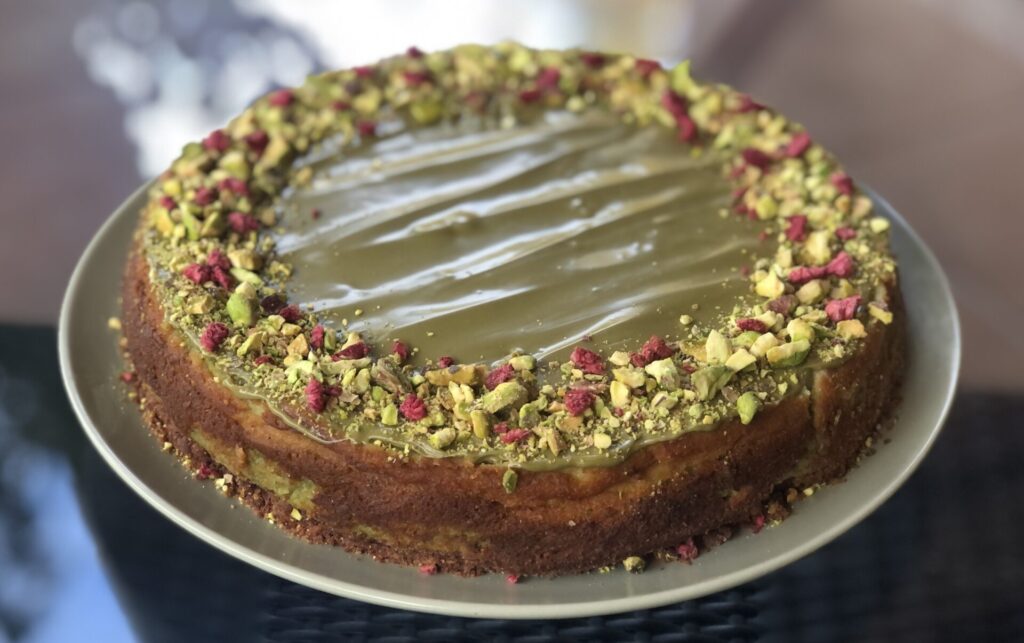 A maradék 45%-os pisztáciakrémet kissé felmelegítjük, hogy folyósabb állagú legyen és a kihűlt sajttorta közepére kezdjük folyatni, majd hajlított kés vagy spatula segítségvel probáljuk szépen elsimítani. Végül tetszés szerint rászorjuk a megmaradt durvára tört pisztáciát. Én szeretek minden pisztáciás sütit kis szárított málnával is díszteni, de mehet rá reszelt étcsoki is ízlés szerint.
